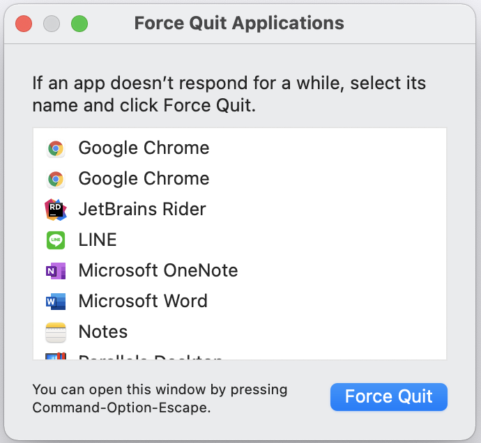 CMD+OPT+ESC: 调出系统对话框,找到要强制关闭的应用,点击Quit按钮即可
